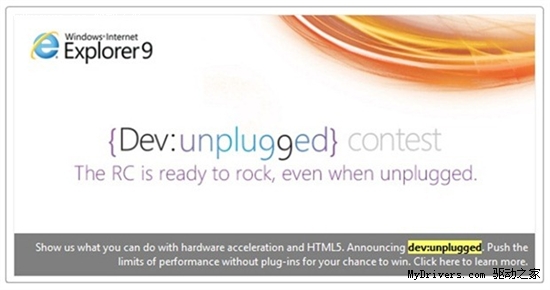 下(xià)午我們終于得(de)到了(le)答(dá)案,My microsoft lift博客作者挖掘到了(le)一張微軟尚未貼出來(lái)的(de)關于IE9 RC的(de)圖片,這(zhè)其中就提到了(le)“Dev:unplugged”。如下(xià)圖: