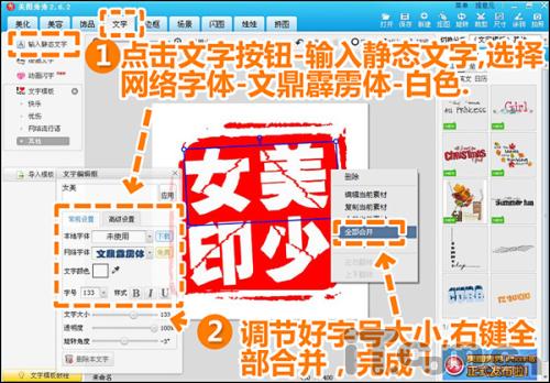 3.接著(zhe)進入“文字”菜單下(xià),選擇輸入靜态文字,點擊網絡字體,選擇文鼎霹靂體,顔色-白色,調節每個(gè)文字的(de)顔色、方向、大(dà)小、字與字之間的(de)間距等參數,最後鼠标右鍵“全部合并”,第一個(gè)網絡圖章(zhāng)就做(zuò)好了(le)。