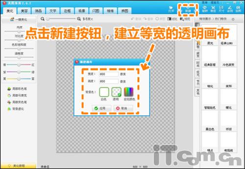 4.如果要做(zuò)透明(míng)水(shuǐ)印,就要用(yòng)到透明(míng)的(de)PNG格式,那接下(xià)來(lái)我們來(lái)做(zuò)第二個(gè)圓形PNG格式的(de)圖章(zhāng),同樣點擊新建菜單,不過這(zhè)回要新建一個(gè)等寬的(de)透明(míng)畫(huà)布。