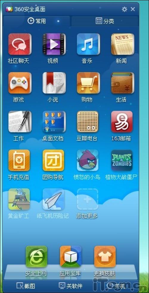 所謂360安全桌面就是整合了(le)“社區(qū)聊天、視頻(pín)、音(yīn)樂(yuè)、新聞、遊戲、小說、購(gòu)物(wù)”等日常必備軟件的(de)一款桌面管理(lǐ)軟件。