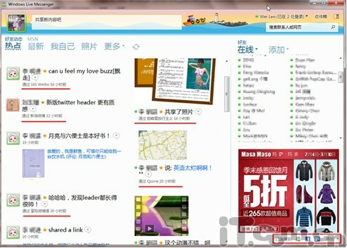 目前,使用(yòng)Windows Live Messenger 2011的(de)用(yòng)戶可(kě)以在“社交面版”或“簽名狀态”看到好友通(tōng)過MSN連接綁定Windows Live Messenger後發布在新浪微博或其他(tā)社交網站的(de)信息。