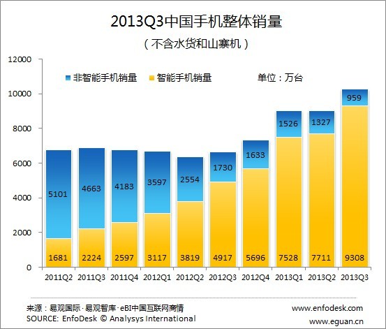 易觀智庫:2013Q3中國手機銷量突破1億 TD-SCDMA占四成