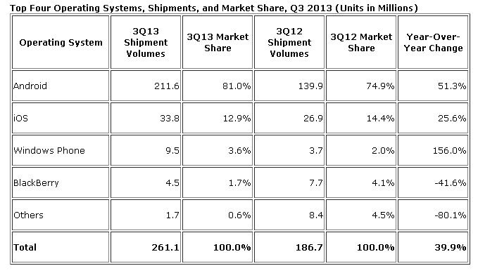 今年第三季度,Android智能機出貨量份額列第一,其中三星産品占39.9%,而其他(tā)Android廠商産品出貨量份額則不足1%;蘋果的(de)iOS平台産品出貨量列第二,份額爲12.9%,出貨量爲3380萬部;而Windows和(hé)黑(hēi)莓分(fēn)類3、4位,其市場(chǎng)份額分(fēn)别爲3.6%和(hé)1.7%。