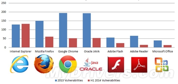 說到漏洞最多(duō)的(de)軟件,大(dà)家腦(nǎo)海中浮現的(de)無非是Flash、Java、IE、Chrome這(zhè)幾款漏洞大(dà)戶。根據Bromium公布的(de)2014年上半年漏洞報告,IE不僅是上半年漏洞最多(duō)的(de)軟件,而且還(hái)是唯一一個(gè)半年漏洞就超過去年一年漏洞總量的(de)軟件。
