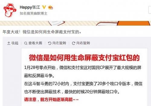 以下(xià)爲網友整理(lǐ)的(de)《微信是如何用(yòng)生命屏蔽支付寶紅包的(de)》全文: