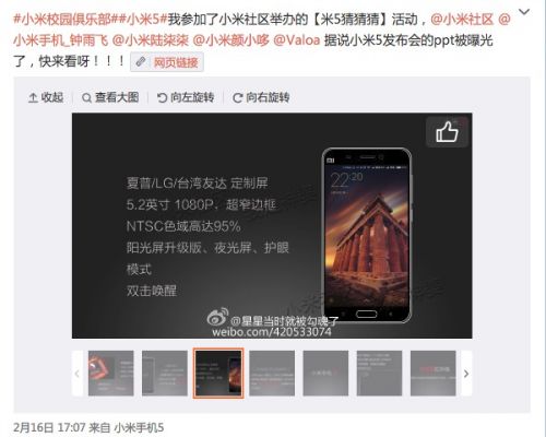 昨天,有微博用(yòng)戶曝光(guāng)了(le)一組據說是“小米5發布會PPT”的(de)相關圖片,而該系列圖片中,關于小米5的(de)各類信息配置一應俱全,大(dà)有提前揭露底牌之勢。
