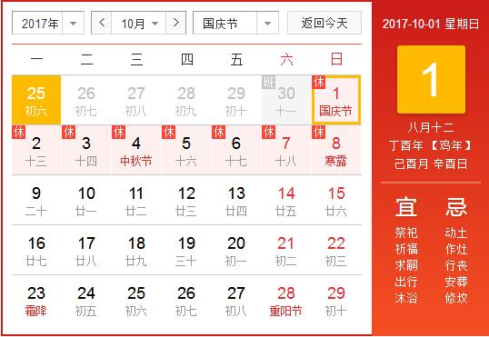 2017年10月(yuè)1日至10月(yuè)8日放假,共8天。與中秋節連休。