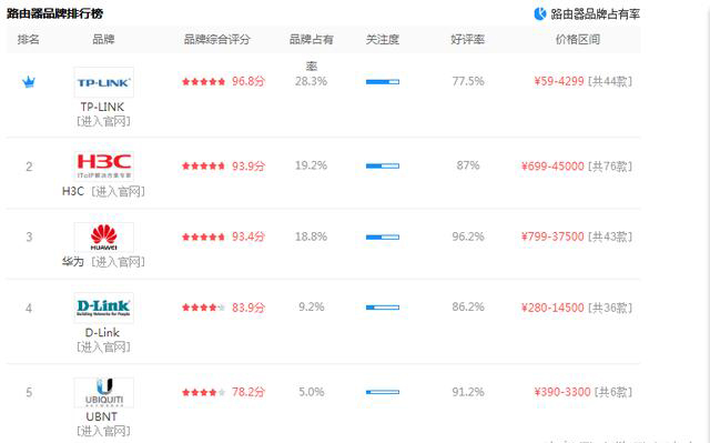 前五名榜首依次爲TP-LINK、H3C、華爲、D-LINK、UBNT,這(zhè)個(gè)産品的(de)排名說明(míng)了(le)2個(gè)問題。