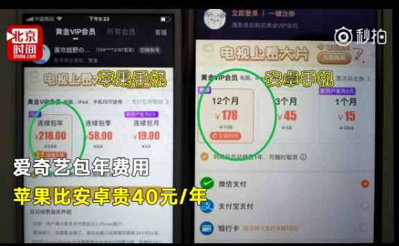 蘋果手機用(yòng)戶被歧視了(le)?買愛(ài)奇藝包年VIP比安卓多(duō)交40元