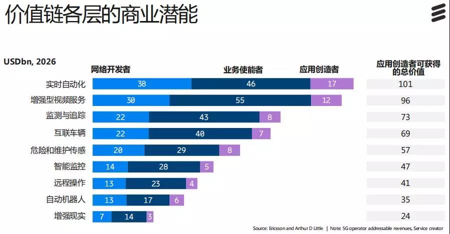 這(zhè)需要運營商抓時(shí)機進行轉型,盡可(kě)能處于5G價值鏈的(de)頂層,從原本的(de)角色向業務使能者和(hé)應用(yòng)創造者轉變。愛(ài)立信認爲,5G可(kě)應用(yòng)在10個(gè)行業中超過200個(gè)細分(fēn)場(chǎng)景,到2026年5G帶來(lái)的(de)收入中,高(gāo)達47%可(kě)被運營商赢得(de)。