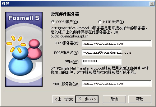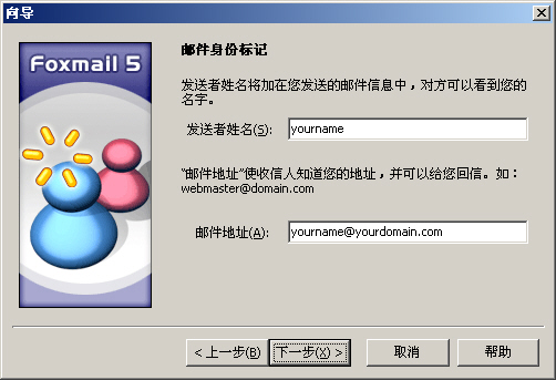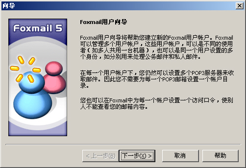 安裝成功後,第一次運行Foxmail時(shí)軟件會出現“Foxmail用(yòng)戶向導”用(yòng)戶可(kě)以通(tōng)過此向導爲自己設定一個(gè)用(yòng)pop3方式接收郵件的(de)yourdomain.com郵箱,點擊“下(xià)一步”;
