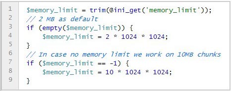 說明(míng):首選讀取php.ini配置文件中的(de)内存配置選項memory_limit,如果爲空則默認内存大(dà)小限制爲2M,如果沒有限制則内存大(dà)小限制爲10M,你可(kě)以結合你php.ini配置文件中的(de)相關信息修改這(zhè)段代碼。